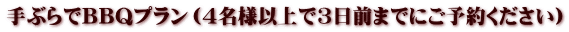 | ※手ぶらでBBQプランのキャンセルについて ・ご利用14日前まではキャンセル料はかかりません。2日以降のキャンセル料は100%申し受けます。人数の増減による変更も2日前までにお願いいたします。 | |
